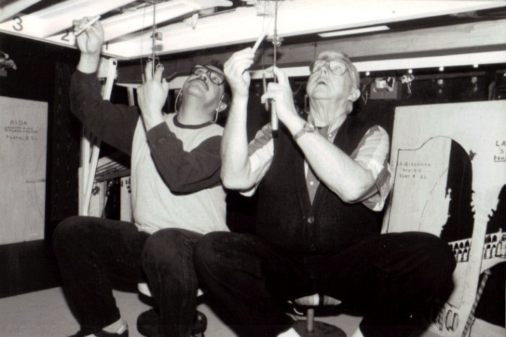Shortly after opening at Park Central in Rolling Meadows in December of 1993, William “Will” E. Harder joined the crew. Will, a retired Motion Picture Executive and cinematographer, had been a close friend of Mr. Fosser’s since the two met in the ’50s while both were working in the commercial film industry. He remained a vital force within the Opera in Focus crew for over a decade, conceiving and executing the beautiful rear-screen projections used in our productions, developing many innovative backstage technical capabilities, and breathing life into our beloved conductor, Maestro Tosci. Will Harder retired at the end of the Puppet Opera’s 2007 season and remained a staunch supporter, technical advisor, and beloved member of the OIF family until his passing in 2014 at the age of 84.